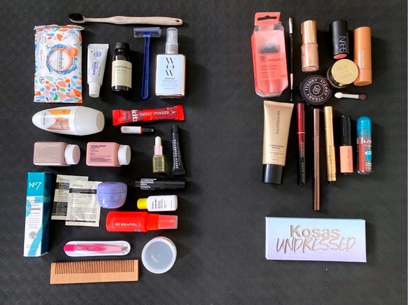 If I’m travelling overseas, I’ll put everything in a ziplock bag, instead of my wash bag, which takes up a lot less space but feels rather sad.
