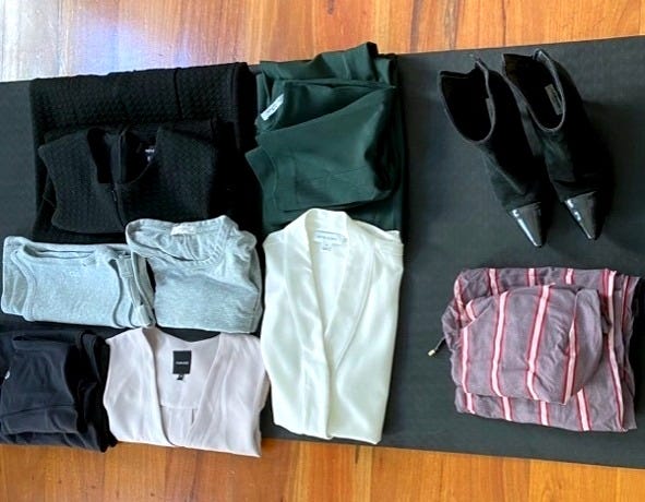 For this trip, I’m packing for two evenings away and three (very full) days of meetings, at least one formal dinner, and an opportunity to use the hotel gym. For fairness, I’m assuming it’s autumn and unseasonably cold.